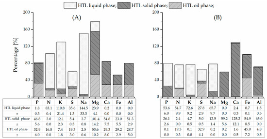Estimated elemental balance for HTL runs of PSS (A) and SPR (B) (MV ± SD; error bars are not shown in the figure).