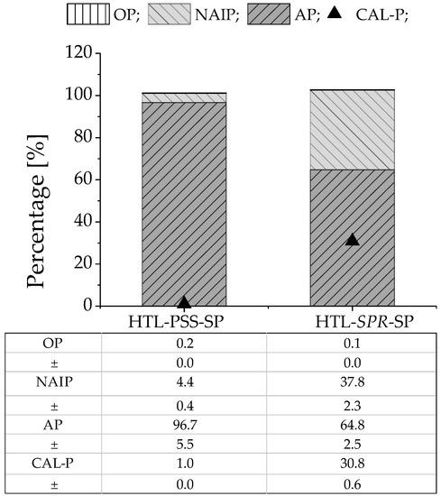 The mass balance that has been presented in Section 3.1 demonstrates that the HTL solid byproduct could be an appropriate point for phosphate recycling and reuse. In view of the aforementioned disadvantages, this work does not further consider the direct use of the HTL liquid. The HTL solid phase from PSS and SPR with the agronomic relevant composition (N-P2O5-K2O) of 0.9-22.7-0.4 and 5.3-13.3-1.9 (Table 1), respectively, may represent a material with properties that are relevant to the application as a fertilizer. For this purpose, the phosphate must be released from the HTL solid phase to become available for the crops. The release behavior of phosphate is related to its form.