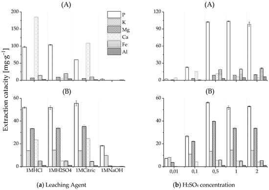 Effect of the leaching agent (a) and H2SO4 concentration (b) on the extraction capacity of elements P, K, Mg, Ca, Fe, and Al for the HTL solid phase from PSS (A) and SPR (B).