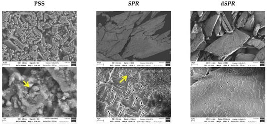 The percentage of each element (Table 2) in the precipitate was compared with the theoretical value for pure struvite as a reference (12.6 wt% P; 5.7 wt% N; 9.9 wt% Mg). It can be concluded that the precipitate correlated well with struvite. This suggestion was further confirmed by the XRD analysis. The XRD patterns of the precipitate matched the reference struvite (see Figure S3). Figure 5 presents the SEM image of the precipitate that was obtained. The SEM images revealed coarse, irregularly shaped crystals of various sizes. The most commonly observed crystals in the precipitate from PSS had an average length of 10 µm. The crystals were larger in the case of SPR. An excess of ammonium ions may account for the larger size, as already illustrated by other research [83,87]. In addition to the struvite crystals, other solid precipitates were found (marked with yellow arrow). This co-precipitates might be amorphous calcium phosphate. The smaller amount of Ca2+ in the case of SPR can result in fewer impurities in the form of calcium phosphate, as evident in the SEM images.