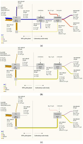 Overall process considerations and mass flow of macronutrients for HTL of PSS (a) and SPR (b,c). The sample ID can be found in Figure 1.