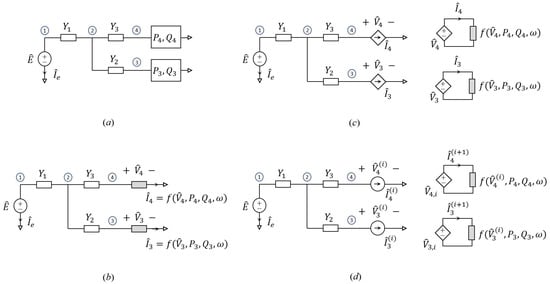 Arbitrary power distribution network with two renewables connected at nodes 3 and 4. (a) Original power network; (b) interpretation of the network as a nonlinear circuit in the phasor domain. The gray boxes represent two-terminal elements defined by nonlinear current–voltage relations in the phasor domain which are equivalent to the renewables defined by the information on power (see text for details); (c) circuit equivalent with controlled circuits, splitting the original network into two parts, a large linear portion and a nonlinear section defined by the nonlinear elements only; (d) circuital interpretation of the proposed iterative solution scheme.
