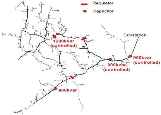 The IEEE 8500 benchmark is considered for the performance assessment of the proposed simulation scheme. It is a large three-phase unbalanced radial network having both MV (medium voltage, primary distribution) and LV (low voltage, secondary distribution) levels and includes most of the components available in a typical North American medium voltage distribution feeder. The placement of the regulators and capacitors on the test feeder are shown in Figure 2. The three-phase network is analyzed through the proposed method detailed in Section 2, yielding to an unavoidable increase in the size of the involved matrices. Both the magnitude and the angle of the nodal voltages associated with the three lines, hereafter labeled as phases a,b and c, are computed. It is important to point out that transformers and regulators are modeled as in [,]. In addition, fixed regulator taps are considered as published in []. In order to provide a fair validation, the obtained results are compared with the ones obtained by means of the Z Bus method [,] and of the open source distribution system simulator (OpenDSS) [], being the latter a reference tool released by the Electric Power Research Institute (EPRI).