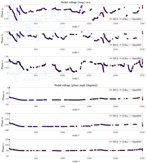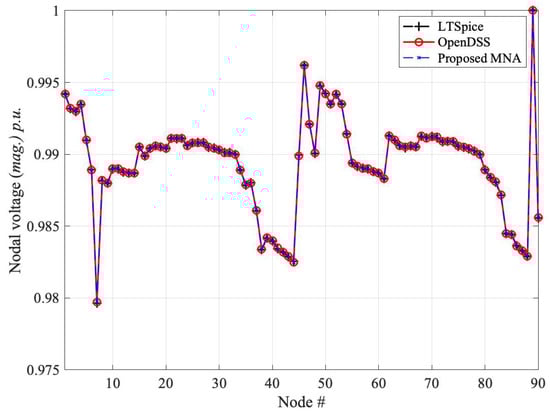 Figure 6 shows the voltage magnitude curve solved through the propsosed MNA method validated with OpenDSS program. The same network is also solved through LTspice by replacing the MNA solution with a SPICE-based solution, leading to overlapped responses. The above comparison also stresses the flexibility of the proposed approach in allowing either a custom MATLAB implementation of the equations or the direct use of any classical software for circuit analysis. The circuital simulation is carried out in AC at the single operating frequency. The netlist is automatically generated based on the topology of the network and on the load definitions at each step of the iterative procedure and is feeding the LTspice solver which produces the phasor responses of the nodal voltages.