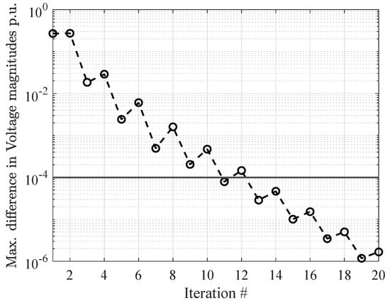 The voltage magnitudes and angles computed by the three methods are shown in Figure 3, highlighting identical results. In addition, Table 2 proposes a compact summary of the performance of the differed methods in terms of simulation time and number of iterations. The above numbers are generated running the scripts on a PC equipped with a CPU Intel Core i7 (seventh generation) and 32 GB ram. In addition, for the proposed approach, Figure 4 shows the maximum voltage difference computed at each iteration, highlighting the typical decreasing staircase behavior of fixed-point convergence where the horizontal line shows the convergence tolerance set to . The above figures and table highlight that the proposed approach has been proven to provide accurate results without any simulation overhead in terms of simulation time. It offers the unavoidable benefit of being general and flexible, thus not requiring any custom solutions for any arbitrary network.