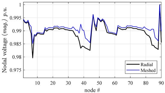 Voltage profile of the Test90 network; differences between radial and weakly meshed configuration.