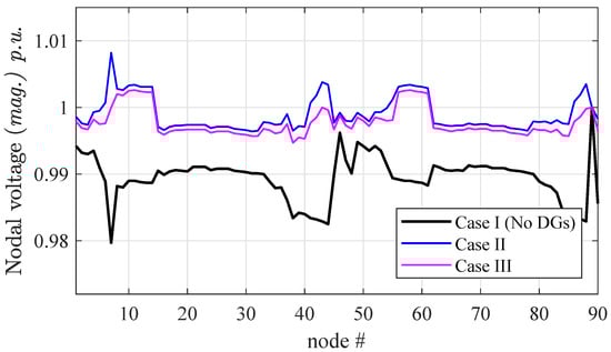In this section, a practical application is carried out for Test90 network where DGs are spread along the network. A statistical simulation aimed at assessing the effects of DGs (either in terms of location but specifically in terms of power generation). Table 3 provides additional details on the different configurations considered for this alternative application in which DGs are not included in the system (case I) or placed in different locations (cases II and III). The latter two cases include PQ and PV types of DGs, for which reactive power is corrected at each iteration according to [,] as stated in Section 2.3.