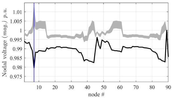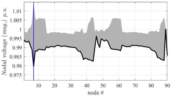 Figure 8 collects the results of the simulation of the network for the above-mentioned configurations, thus highlighting the deterministic impact of the DGs, along with their placements. As a second and more realistic application, the Test90 radial distribution network is analyzed for variability analysis of DGs power ratings, to simulate practical conditions when DGs are spread along the network. Specifically, the power of DGs is assumed not being constant but is varying throughout the day according to weather conditions, with the aim of observing the change in the voltage profile. Two tests are carried out, based on Monte Carlo simulations performed by varying DGs power in the range around their nominal rated capacity (see Figure 9), and in the range (see Figure 10). The latter case corresponds to an extreme simulation stressing the wide range of effects arising from the possible unpredictable behavior of DGs. In addition, Figure 11 shows the probability density function of the voltage of node 7 (i.e., the node with the highest load). From Figure 10 the band in the voltage profile is observed and the behavior of the distribution network (which relies largely on DGs) can be predicted. This can help utility and stakeholders to understand the effects of renewables’ variability and unhealthiness of the network. It is to state that Monte Carlo simulation is used to observe the stochastic behavior of the network because we keep only two or three parameters of DGs as varying so simple Monte Carlo method holds, however, if the number of parameters is large, other methods are preferable for analyzing the uncertain behavior [,,,].