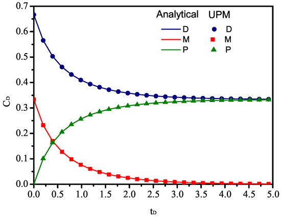 In this section, we first present the validation for the UPM-based chemical reaction module in porous medium. The simulation results of the homogeneous chemical reaction are contrasted with analytical solutions of reaction in a free fluid. Moreover, additional models in the above UPM-based mix model (fluid flow problem and hydraulic-transport coupling problem) have been validated in [78,79]. Due to the quasi-implicit method used in our model, a convergence test is conducted to consider the influence of time step on the final results. The effects of operational factors (atmospheric pressure and reactive temperature), materials factors (reactant concentration), and geometry factors (fracture aperture and fracture dip) are discussed in a sensitivity analysis, thereby analyzing the influence of precipitation on the whole reaction.