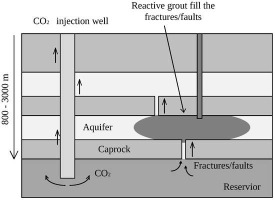 Diagram of reactive grouting for the CO leakage remediation. Reference from [73].
