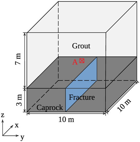The existence of a high permeable fracture embedded into the caprock may lead to the significantly leakage of CO. The injection of appropriate reactive grout into the aquifer overlying the caprock filling with the pores around the fracture is regarded as an effective method to remedy the CO leakage, as shown in Figure 2. In order to simulate this process, a 3 m thick caprock, with a single fracture throughout it, in a cube with dimensions of (10 m × 10 m × 10 m) is modeled, as shown in Figure 3. Initially, the pores above the caprock are full of the reactive grout in advance of the occurrence of CO leakage. The concentration of reactive chemical species Si in the solution is 2720 mol/m [73]. The whole domain is set with a constant temperature (25 C). The atmospheric pressure on the top boundary is 10 bar. CO leakage at a constant flow velocity m/s) and concentration (316 mol/m) at the bottom boundary [2]. The concentration of CO(g) is redefined as the concentration of CO(aq) in groundwater. Other parameters employed in this simulation are listed in Table 1. In Chen et al. [69], it is pointed that, for the precipitation reaction, the reactants A(aq) is a kind of carbonate or bicarbonate, and B(aq) is a kind of toxic cation, which is the same condition as expressed in this paper, so the value of is defined from Chen et al. [69].