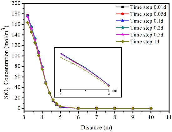 Since our method is quasi-implicit to calculate the total reaction rate through the concentration of reactant at the last time step, six time steps are selected to conduct the sensitivity analysis, as shown in Figure 4. The concentration of SiO is chosen from the central line of the domain along the z-axis above the caprock since the model is symmetrical about the fracture plane. The total simulation time is 10 days. Figure 4 shows that the final results are convergent with the reduction of time step, and they are not sensitive to the selection of time step when the time step is less than 0.5 days.