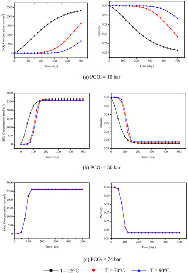 Sensitivity analyses are further carried out with respect to the atmospheric pressure, formation temperature, the initial reactant concentration in the grout (Si), and fracture aperture. A different atmospheric pressure (P) and a different formation temperature (T) will influence the solubilities of CO (CO(g) → CO(aq)). The solubilities at each P and T are calculated from the model presented by Duan and Sun [82] and are listed in Table 2. Figure 5a–c shows the variation of precipitation concentration (SiO) and formation porosity with time at three different atmospheric pressures (10 bar, 50 bar, and 74 bar) and temperatures (25 C, 70 C, and 90 C ) in the observation Point A, as shown in Figure 3 (which is in the middle line of the domain and is 1.5 m higher than the caprock). It is observed that the quicker growth of SiO concentration will cause the faster drop of porosity of formation. This is because the growth of precipitation will plug the voids of the rock. At the low atmospheric pressure, the drop of the porosity is slower than that of high pressure, since the solubilities of CO at high pressure are larger. Although the reaction rate constant increases with temperature, the total variation rate decreases with the increase of temperature. At P of 10 bar and T of 25 C, the concentration of SiO and porosity vary gradually with time, while they keep almost unchanged when Time is less than 200 d at T of 70 and 90 C. At P of 50 bar and 74 bar, the porosity drops quickly and tends to keep steady after 150 d.