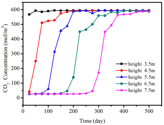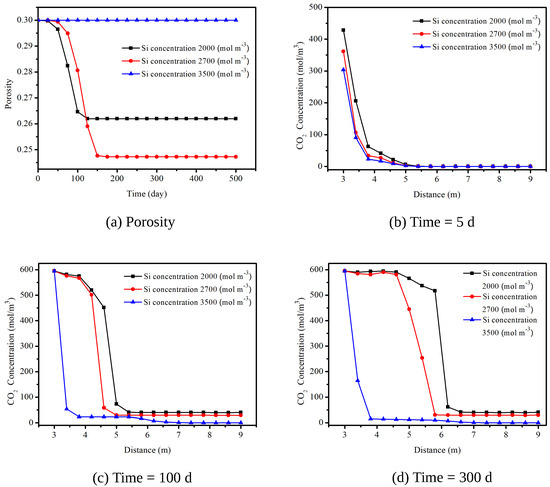 Variation of porosity over time at Point A under different initial grout reactant concentration (Si) is shown in Figure 6a. When the Si concentration in the grout is 3500 mol/m, the porosity is a constant as the initial porosity. The rapid drop is observed at the Si concentration of 2000 mol/m, while the porosity reaches the minimum value at the Si concentration of 2700 mol/m. This is because when the concentration of reactant Si is high, once CO flows into the aquifer full of grout, the reaction will happen quickly, and the volume fraction of precipitation product is large enough to clog the void to stop CO further reveal into the atmosphere, as shown in Figure 6b–d. The concentration of CO is zero when the height is more than 4 m. Please change the unit not to be italic if unnecessary. at the Si concentration of 3500 mol/m and the leakage distance of CO is unchanged with time. For the low concentration of reactant solution, the pores of the formation cannot be clogged completely, and the CO continues to release. But, the flow rate of CO is large with the low Si concentration.