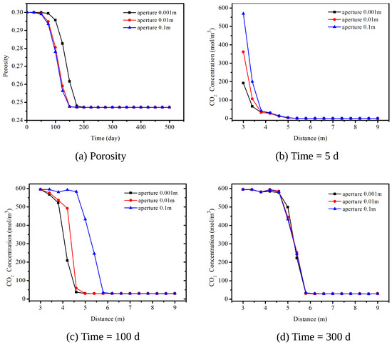 Influence of fracture aperture on CO sequestration; (a) the variation of porosity with time; (b–d) the variation of CO concentration with distance on five days, 100 days, and 300 days.