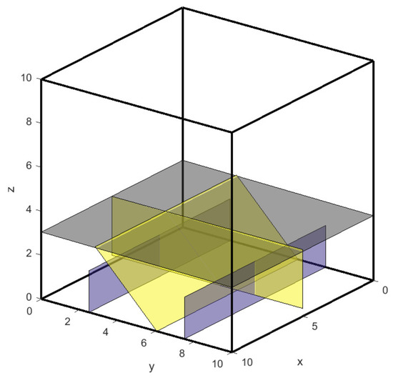 Previous versions of fracture networks in caprock are generated in this section to simulate the CO sequestration process in the reservoir. The simulation model is still a cube, and the size of model is identical to Figure 3; however, there are four large fractures connected with each other are embedded in the caprock as the main path for CO leakage, as shown in Figure 9. The aquifer above the caprock is formed of sandstone with initial porosity of 0.3 and critical porosity of 0.2735 [73]. The aperture of each fracture is 0.001 m, and the intact caprock is regarded to be impermeable. The grout is silicate solution with Si concentration chosen as 3000 mol/m and 3500 mol/m, respectively. CO begins to release from the bottom of the model at a constant flow velocity ( m/s). A constant pressure and a constant temperature is set along the outlet boundary. The atmospheric pressure is 50 bar, and the formation temperature is 70 C. The total simulation time is 500 days. Other parameters are same as listed in Table 1. The fractures are discretized as triangle elements, and the rock matrix is discretized as tetrahedron elements based on an advanced adaptive mesh method [83].