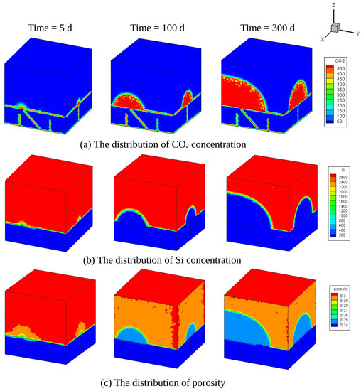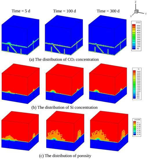 Figure 10a–c shows the distribution of CO concentration, Si concentration, and porosity at different times with the Si concentration in grout of 3000 mol/m. When the fracture is non-penetrative in the caprock, CO cannot leak into the aquifer through such a kind of crack. However, if they connected with other fractures that cut through the whole caprock, it still influences the final leakage effect. The distribution of Si concentration is adverse to that of CO, and the reduction of Si concentration is consistent with the drop of porosity. The region of increased CO concentration and reduced Si concentration and porosity spread simultaneously in the aquifer with time. At the early stage (the simulation time is five days), the fractures are filled with CO since the permeability of fractures is relatively high, which provide channels for CO release with high velocity. Furthermore, the amount of CO emission from two respective penetrative fractures is almost same. The distribution of CO is mainly along the fracture walls, and then CO releases upward. The leakage region is small and surrounds the fracture walls. With the increase of time, CO continues to diffuse into the aquifer along the fractures because the voids of the aquifer are not clogged completely and the porosity does not drop to the critical value (see Figure 10c). The leakage region in x-direction is larger than that in the y-direction. This is because the amount of CO leakage along the oblique fracture is influenced by the fracture that is parallel to y-axis. This can be explained by Figure 11, in which there is an obvious inflection point where CO concentration starts to increase quickly at a certain time at different location. It can seen from Figure 12 that, although CO continues to leak, the concentration stops to react at a low concentration. Thus, once the Si concentration and porosity stop to reduce, it will keep the same condition all the time. Such phenomena are caused by the reaction threshold, since the concentration of reactant is too low, and the reaction on the surface of fluid–solid cannot happen.