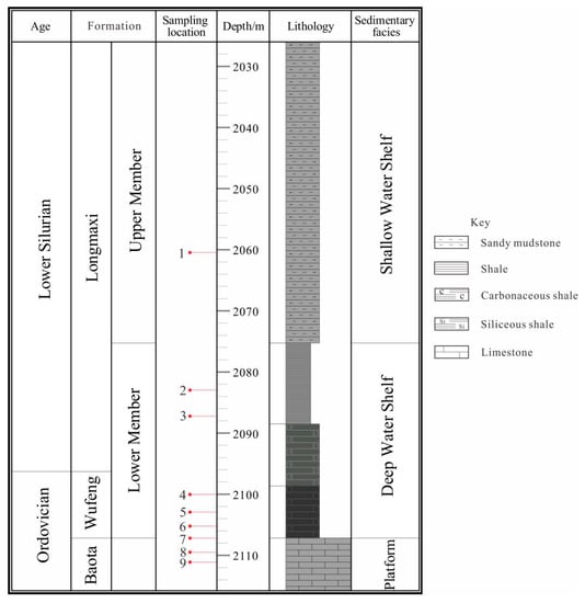 Nine drill core samples from well SY3 underwent a series of laboratory tests (Figure 3). Two of the samples are from the Upper Ordovician Baota Formation. The remaining seven are from the Upper Ordovician Wufeng Formation and Lower Silurian Longmaxi Formation, which are important shale gas-bearing layers in the Sichuan Basin and its peripheral regions in southwest China. The paleogeographic settings of these formations in the study area have been reported in previous works [,]. Briefly, the upper member of the Baota Formation mainly consists of limestone with polygonal reticulate structures developed in a platform environment. The Wufeng-Longmaxi Formation can be divided into two sections according to their sedimentary facies. The Lower Member of the Wufeng-Longmaxi Formations is dominantly made up of deep black siliceous shale, carbonaceous shale, and gray-black shale [], indicating a deep-water shelf sedimentary environment. The primary lithology of the Upper Member of the Longmaxi Formation is gray, silty mudstone, and argillaceous siltstone, deposited in a shallow-water shelf sedimentary environment.