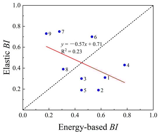 Energy-based brittleness indices do not correlate with Poisson’s ratio (Figure 8). Under triaxial compression, the applied confining pressure tends to hinder the radial dilation during the post-peak region. Consequently, most Poisson’s ratio values fluctuate in a small range of 0.2 to 0.3, leading to the weak correlation between Poisson’s ratio and brittleness. This observation is also confirmed by others [,].