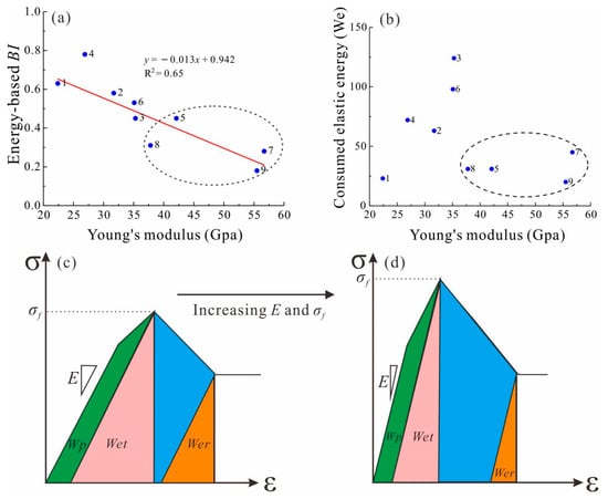The relationship between brittleness index and Young’s modulus. (a) A negative correlation of Young’s modulus and energy-based BI; (b) Samples 5, 7, 8, and 9 with higher Young’s modulus consume less elastic energy (We, the difference between Wet and Wer); (c,d). The change of energy with the increase of Young’s modulus and peak strength (σf). Wp (plastic energy), Wet (total elastic energy), Wer (residual elastic energy).