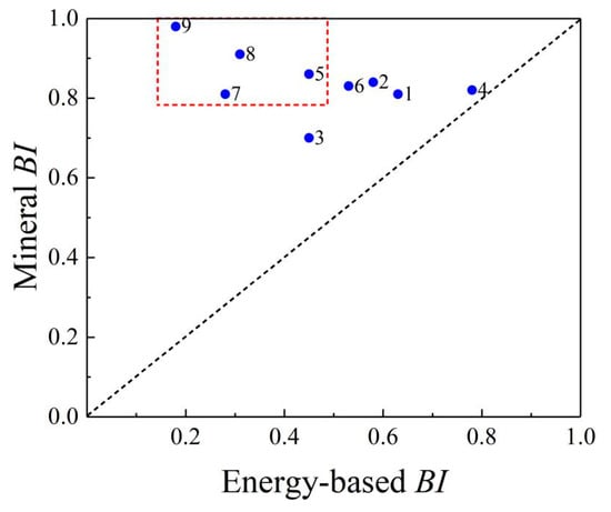 In this formula, quartz, feldspar, carbonate minerals, and pyrite are regarded as brittle minerals, while clays are regarded as plastic minerals. For the method based on mineral compositions, a higher content of brittle minerals and lower content of plastic minerals leads to a more brittle rock (higher BI). The calculated brittleness indices attained from rock mineral compositions are vastly higher than the energy-based brittleness index (Figure 9). The mineral BI of samples 1, 2, 3, 4 and 6 are in the range of 0.70–0.84, with an average of 0.8. The energy-based brittleness indices of these five samples are in the range of 0.45–0.78, with an average of 0.6. Although there is not a strong positive correlation between these two calculations for these five samples, generally speaking, the differences between these two BI are still within a reasonable range. The minor difference may be influenced by other factors, such as rock texture, the content of organic matter and porosity. However, it is worth noting that the mineral BI of samples 5, 7, 8, and 9 are high, in the range of 0.81–0.98, with an average of 0.89, but their energy-based brittleness indices are low, in a range of 0.18–0.45, with an average of 0.28. There is a considerable difference between the two calculation methods for these four samples (marked by a red dotted line in Figure 9).