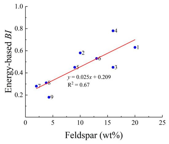 The relationship between Young’s modulus and brittleness has been discussed by many scholars. The brittleness evaluation method proposed in [] supposes that a higher Young’s modulus results in a more brittle rock. In [], it is believed that a formation with higher Young’s modulus values induces more microcracks, which shows a strong brittleness inducing a more complex hydraulic fracture system. On the contrary, the paper [] proposes that rocks with a high Young’s modulus only create shorter fracture apertures for their limited deformation ability. In contrast, rocks with a low Young’s modulus tend to form fractures with larger average apertures. This leads to fracturing fluids penetrating the fracture tips quickly, resulting in a greater fracture conductivity. The experimental data in this study indicates that Young’s modulus is negatively correlated with energy-based brittleness indices (Figure 6a). As shown in Figure 6b, samples 5, 7, 8, and 9, which have higher Young’s modulus values, consume less elastic energy (We). Specifically, the stored elastic energy in rocks with higher Young’s modulus values is not enough to self-sustain the development of cracks, leading to the reduction of the brittleness index. The relationship between the stress-strain curve and Young’s modulus also further proves this conclusion (Figure 6c,d). Young’s modulus (E) of the specimens tend to increase with the increasing peak strength (σf) (Figure 7), which is also verified by others [,]. Therefore, assuming other parameters remain constant, an increase of Young’s modulus (E) and peak strength (σf) results in decreased the consumed elastic energy (the difference between total elastic energy (Wet) and residual elastic energy (Wer)), and additional energy (the sum of blue area and orange area as shown in Figure 6c,d) is necessary to maintain the development of cracks. This results in the decreased brittleness of the rocks.