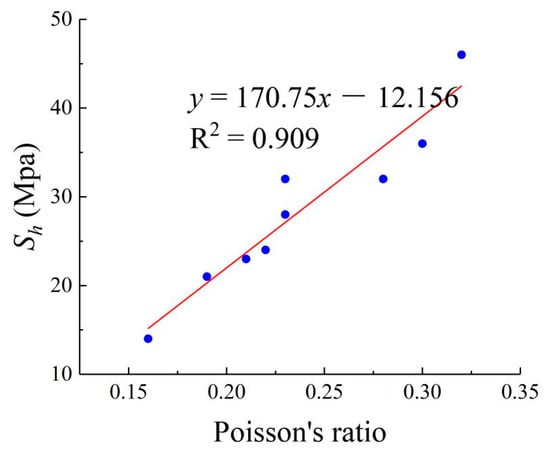 The minimum horizontal stress and fracability index of the formations in which the nine samples located are calculated and summarized in Table 3. Additionally, according to the formula for Sh (Equation (12)), the minimum horizontal stress increases with the increased Poisson’s ratio which ranges between 0.1 and 0.45. The Poisson’s ratio of the nine samples are positively correlated with the minimum horizontal stress of the formations in which the samples are located (Figure 18). Small fluctuation in Poisson’s ratio can also cause substantial changes in the minimum horizontal stress. Therefore, Poisson’s ratio indirectly affects the fracability through controlling the minimum horizontal stress, and the fracability index decreases with an increasing Poisson’s ratio (Figure 19).