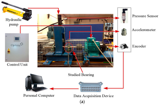 The experiments were performed at a shaft speed of 1500 rpm, at which different radial loads, i.e., 0 bar, 10 bar, 20 bar and 30 bar, are applied, in which the higher load of 30 bar is equal to 2400 N, corresponding to 12% of the rated dynamic load. This allows the diagnostic capability to be evaluated under low load conditions to avoid any other defects that may be induced under higher load operations. Based on the operating speed, bearing characteristic frequencies are calculated and listed in Table 1.