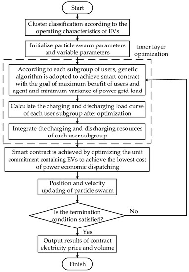 Firstly, k–means algorithm and quartile method are used to cluster the travel time of users, and the initial residual power of EVs is classified. The user subgroups with different driving characteristics are formed. Then, particle swarm optimization is used as the outer layer optimization and genetic algorithm as the inner layer optimization to solve the smart contract models. Each chromosome represents the volume of electricity left in each vehicle in a user subgroup. The inner layer algorithm first optimizes the residual power of each user subgroup one by one to obtain the optimal charging–discharging control state. What’s more, based on the optimization results of the inner layer, the outer layer algorithm optimizes the overall charging–discharging electricity price and unit commitment. So that the market subjects can reach a smart contract with each other. The specific solution process is shown in Figure 2.