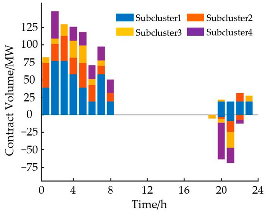 As can be seen from Table 5, although the agent’s participation in the charging–discharging scheduling control increases the battery loss of users, the total cost of users is reduced on the whole. It is because of the economic regulation and DRM such as discharging compensation and profit sharing. At the same time, the agent also gains certain benefits through the price difference of electricity purchase–sale. The power grid company based on dispatching plan purchases the discharging volume from EVs in peak periods, which increases the cost of electricity purchasing. However, the flexible charging–discharging resources provide additional effective dispatching means for the unit commitment. This mechanism greatly reduces the expenses of startup and shutdown, and achieves the optimal cost of economic dispatching. In conclusion, the bidding trading mechanism designed in this paper effectively achieves a win–win situation among users, agent, and the power dispatching center.