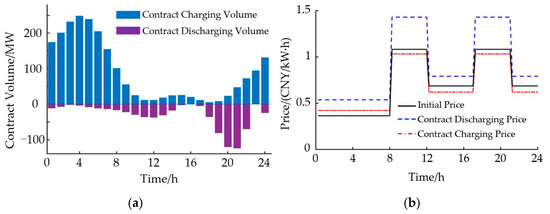 - The total number of cars is 1 million, and the penetration rate of EVs is 5%. All users participate in day–ahead market bidding through the V2G dispatching of agent. Specific EV parameters are shown in Table 1.