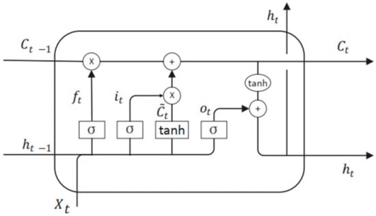 LSTM models belong to the family of deep recurrent neural networks that have been widely used across different domains such as language modeling, sentiment analysis, speech recognition, and time-series models [30]. LSTM models and their variants achieve good performance when the temporal dependency in the sequential data is an important implicit feature, and learning from earlier stages is essential to forecast future trends. Compared to a standard feedforward neural network, LSTM contains cycles that feed network activations from a previous time step as inputs to the network to influence predictions at the current time step. Thus, the recurrent connection allows the model to develop a memory of previous events, which is implicitly encoded in its hidden state variables. The network takes three inputs: xt is the input at the current time step, ht-1 is the output from the previous LSTM unit, and ct-1 is the memory of the previous unit. As for outputs, ht is the output of the current network, and ct is the memory of the current unit. The LSTM model has input it, output ot, and forget ft learnable gates that modulate the flow of information and maintains an explicit hidden state that is recursively carried forward and updated as each element of the sequential data is passed through the network, as shown in Figure 1. The input gate decides what information to add from the present input to the cell state, the forget gate decides what must be removed from the ht-1 state, thus keeping only relevant information, and the output gate decides what information to output from the current cell state.