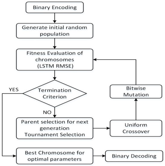 Each chromosome is a binary encoded representation of the parameters to be optimized, and they correspond to the lag inputs and LSTM hyperparameters, as stated in Table 1 and Table 2. The initial population comprised of 20 chromosomes, represented as a sequence of 69 binary genes, was created, and it represents the parameters to be searched, as depicted in Figure 9.