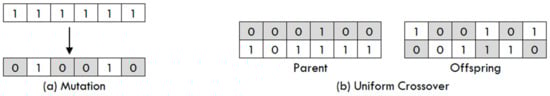 Genetic operators such as crossover, mutation, and selection are used to maintain genetic diversity, which is necessary for the evolution process. In general, the selection mechanism facilitates the exploitation of the accumulated information resulting from the GA search, while the crossover and mutation operators account for the exploration of new regions of search space. Selection operation emphasizes fitter individuals in the population, with the aim that their offspring has a higher fitness to survive in the next generation. Crossover generates new individuals by replacing some parts of two parents’ individuals, while the mutation operator changes some genes of the individual string. The operators of mutation and uniform crossover are depicted in Figure 3.