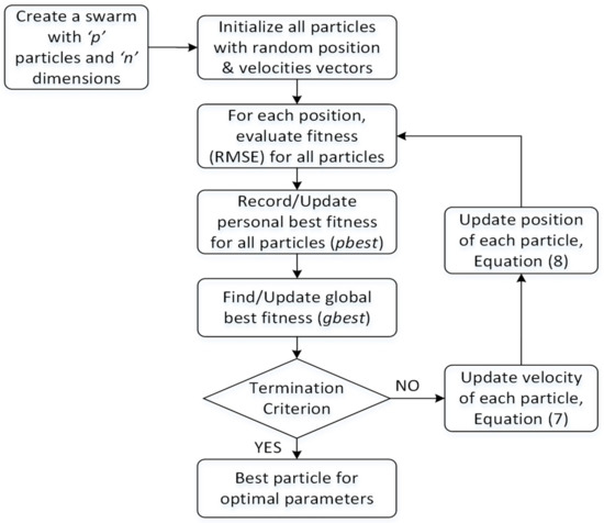 Particle swarm optimization developed by Kennedy and Eberhart in 1995 was inspired by the social behavior [38]. It is evolved by imitating the social behavior of a school of fishes and a flock of birds that collectively search for the best locations and are likely to move close to an optimum fitness function [39]. In particle swarm optimization, entities called particles are positioned in the search space of the problem. Each particle calculates the objective function at its current location. The movement of each particle in the search space is determined by its personal best and swarm best, enabling stochastic exploration of solution space. Each particle has a vector representing the speed of the particle in each dimension along with a reference to the best state in which it has been so far. PSO is different from a GA in the sense that it contains a network of communication among particles of the swarm. For each step, the velocity of particles is changed toward local and global best locations until a defined termination condition is reached. The algorithm for PSO is depicted in Figure 4.