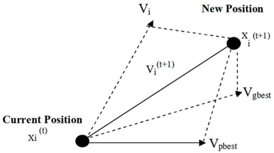 Every particle is a candidate solution to the problem to be solved. These particles are interacting and learning from each other, while maintaining a memory of their personal best and global best position. The new position of the particle is thus a function of three vectors: personal best, global best, and previous velocity vector. Figure 5 shows the concept of changing the position xi of a particle from the current position following the calculations made based on the current position, personal, and global best.