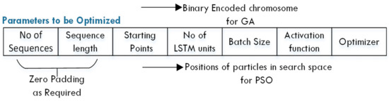 Considering the nature of the electric consumption sequence and the LSTM hyperparameters, the GA was represented as a binary coded model, which is the most common way of encoding, where an individual or combination of bits in the string represents some characteristics of the solution. The role of genetic operators in an evolutionary algorithm is very crucial, as they have a strong effect on the performance of the algorithm. The encoding of the problem and the genetic operators are described in the sub-sections below.