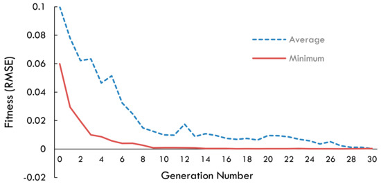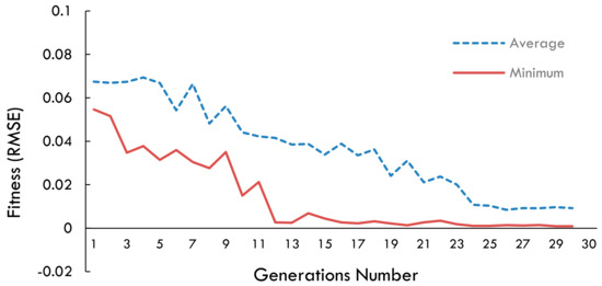 The time series LSTM models were developed in Python using the Keras API running on top of the TensorFlow backend. A detailed design configuration for the LSTM network, the GA, and PSO metaheuristics representation and parameters, as defined in Section 5, was used for the experiment. The search space for the lagged inputs and hyperparameter selection as stated by the two metaheuristics ran for 30 generations. To speed up computations, we ran both metaheuristics on a reduced dataset. Fitness graphs of the normalized RMSE scores for the GA and PSO search are shown in Figure 10 and Figure 11. The continuous curve is the minimum fitness, and the dashed curve is the average fitness across the generations.