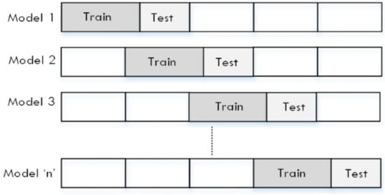 A two-sample t-test at a 0.05 level of significance was conducted to ascertain if the differences in the average CV(RMSE) scores of the best solution found using the metaheuristic approach were significantly better those of the best two machine learning benchmarks (i.e., random forest and SVR, as shown in Table 4) and of the expertly calibrated multi-sequence. A walk forward sliding window k-fold validation approach was used to test these models. For each of the windows, the testing and training dataset sizes remain fixed while traversing the complete dataset, as illustrated in Figure 13.