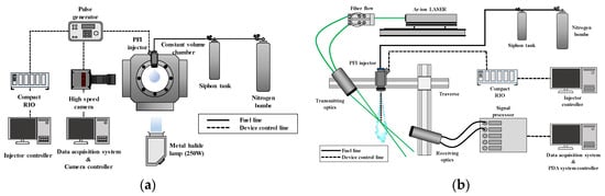 Schematic diagram of (a) spray visualization system (b) droplet size velocity measurement system (PDA system).