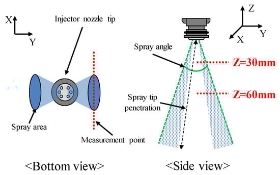 Figure 1b is a PDA device for measuring the size and velocity of spray droplets. PDA tester is also composed of a fuel supply unit, a signal control unit, and a measuring unit. The PDA used in this study was a 1D-PDA system that was capable of measuring the droplet size and the vertical velocity. An Ar-ion laser with a wavelength of 514.5 nm was used as the light source. The collection angle was set to 35° and the focal length was 400 mm according to the fuel used in this study. Measured data were converted into data through a signal processor and stored in a computer. Figure 2 shows a schematic of the measurement area for the PDA experiment. To analyze the size and velocity of spray droplets, the PDA experiment was carried out by selecting a point 30 mm or 60 mm away from the injector tip where the spray was considered to be fully developed downstream. Twelve holes were divided into two groups of six and sprayed. It was assumed that two spray plumes were symmetrical. Therefore, spray droplets sprayed from one spray plume (from six holes) were analyzed by PDA experiment. In addition, the experiment was performed by selecting Y = 8 mm in Z = 30 mm and Y = 14 mm in Z = 60 mm, which was considered to be the spray center because the spray was not widely spread due to the PFI system characteristics.