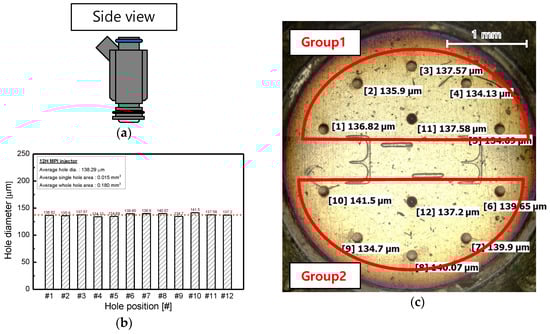 Specifications of PFI system used in experiment: (a) Schematic diagram of 12-hole PFI system, (b) measured each hole diameter, (c) close-up photograph of orifice using SEM.