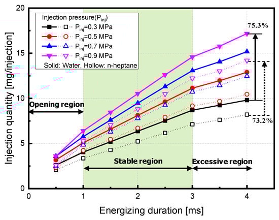 Figure 4 is a graph comparing the injection quantity of water and n-heptane according to the change between injection pressure and energizing duration. The injection pressure was changed to 0.3 MPa, 0.5 MPa, 0.7 MPa, and 0.9 MPa and the energizing duration was changed from 0.5 ms to 4.0 ms in 0.5 ms units. As shown in Figure 4, the injection quantity of water and n-heptane increased with increasing injection pressure and energizing duration. In addition, the injection quantity of water was about 21% higher than that of n-heptane. This is because the density of water is larger than that of n-heptane. In general, the injection flow rate of the fluid was proportional to the density when the flow cross section and the velocity (or differential pressure) were constant.