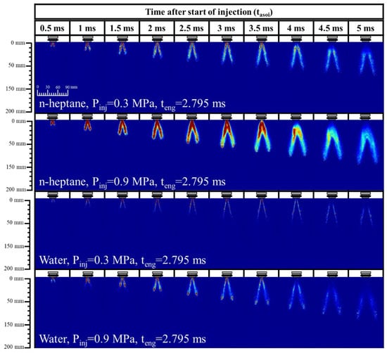 Spray developing process of water and n-heptane according to the time after start of injection (Pinj = 0.3 MPa and 0.9 MPa, Pamb = 0.1 MPa, teng = 2.795 ms).