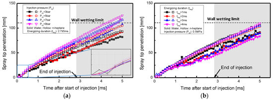 Figure 6 shows spray tip penetration characteristics of water and n-heptane according to the change of injection pressure and current. Under the same spray conditions, spray tip penetration of n-heptane was 11.2–17.6% longer than that of water. Despite the high density of water, the spray tip penetration of water was shorter than that of n-heptane due to the high surface tension and viscosity. As shown in ‘Region A’ of Figure 6a, the development of spray was unstable at the initial stage of spray (about 0.5 ms after spraying). Therefore, it was difficult to confirm the clear difference in spray tip penetration according to injection pressure and test fuel. Under all test conditions, the spray tip penetration increased linearly with time after start of injection. The increase in injection pressure affected the initial velocity increase of the spray, leading to an increase in spray tip penetration (according to Bernoulli’s equation, the velocity was proportional to ). As the injection pressure increased from 0.3 MPa to 0.9 MPa, water increased up to 31.7% and n-heptane increased up to 22.5%. In Figure 6b, however, the change of the energizing duration did not significantly affect the spray tip penetration of n-heptane or water. This is because the change of energizing duration under the same injection pressure (differential pressure) condition does not affect the velocity of initial droplets.