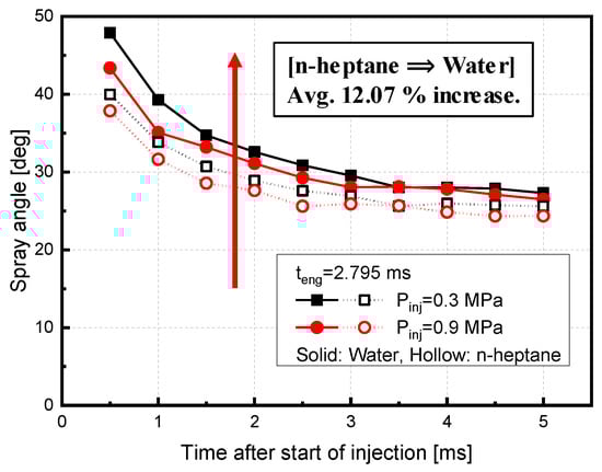 Spray angle characteristics of water and n-heptane according to time after start of injection (teng = 2.795 ms).