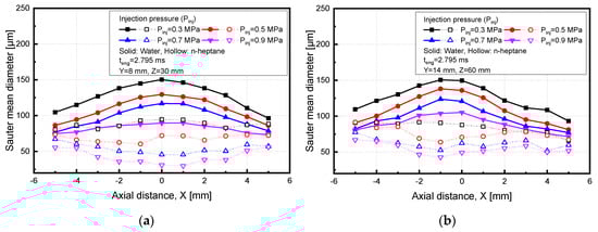 Average size characteristics of water and n-heptane under different injection pressure at (a) Dtip = 30 mm, (b) Dtip = 60 mm.
