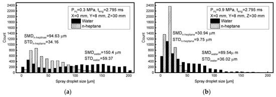 Droplet size distribution of water and n-heptane under two injection pressure at (a) Pinj = 0.3 MPa, (b) Pinj = 0.3 MPa (teng = 2.795 ms, X = 0 mm, Y = 8 mm, Z = 30 mm).