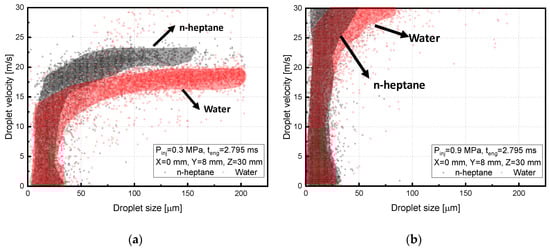 Comparison of distribution correlation of droplet velocity and size of water and n-heptane at (a) Pinj = 0.3 MPa, (b) Pinj = 0.9 MPa.