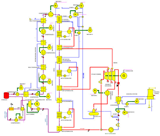 where and are isentropic efficiencies for steam turbine and pump; and are generator mechanical and electrical efficiencies; is water pumps work; is steam mass flowrate; is water mass flow; and is high/middle/low-pressure steam turbine work. The gas turbine electrical power was calculated from the following equation: